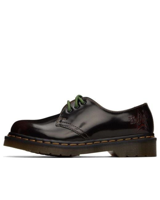 The dr martens 1461 3hole x the clash is a signature sneaker crafted with care by arcadia. It features a glossy leather upper with a layer of paint, designed to be wiped away to reveal a cherry red dye. The heel is boldly stamped with the band's logo. It is finished with army green and black laces and classic yellow edging. Each pair comes with a band logo dog tag. This sneaker is perfect for everyday wear, with its stylish design and comfortable rubber sole.