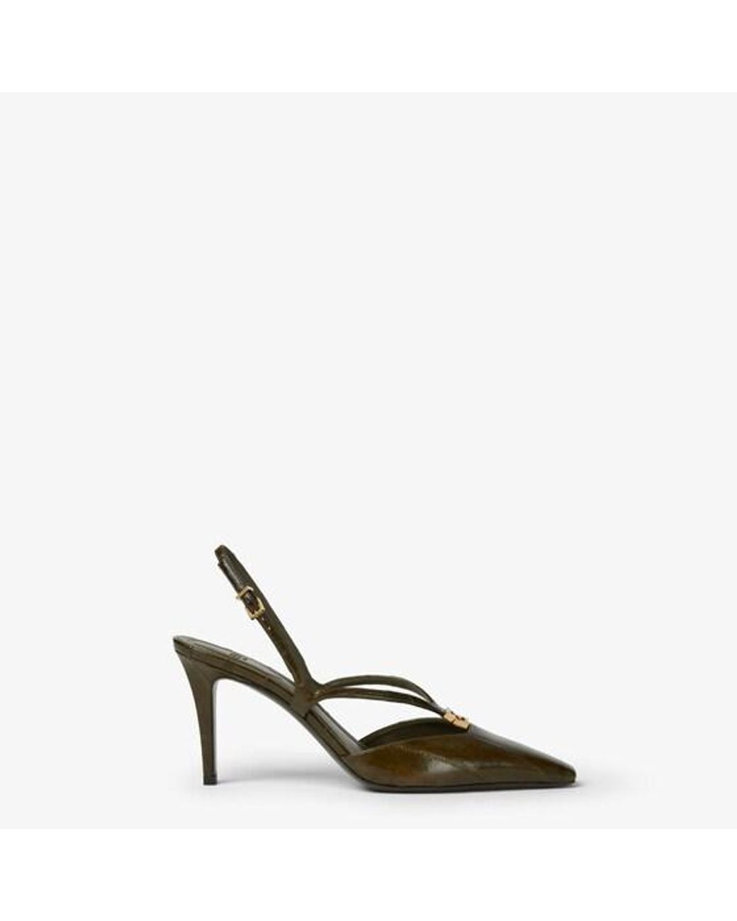 Slingbacks with square toe and straps that wrap around the foot. The metal FF detail, with a special design that includes a functional hinge in the center, makes them comfortable to walk in. Made of shiny olive green hagfish leather. Tone-on-tone leather covered heel. Gold-finish metalware. Made in Italy. Size 39 Color: green