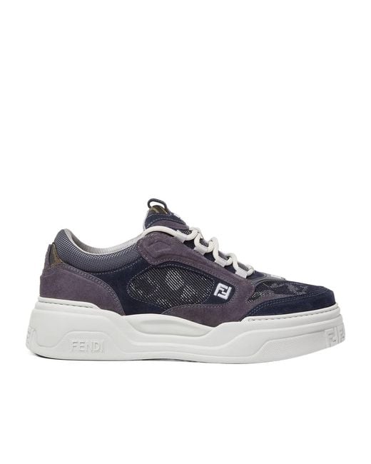 The Fendi Force lace-up low-top shoes are adorned with blue Fendi Falena jacquard fabric and tonal quilting elements, featuring FF embroidered details on the sides, and FF patterns on the toe and heel. Color: blue
