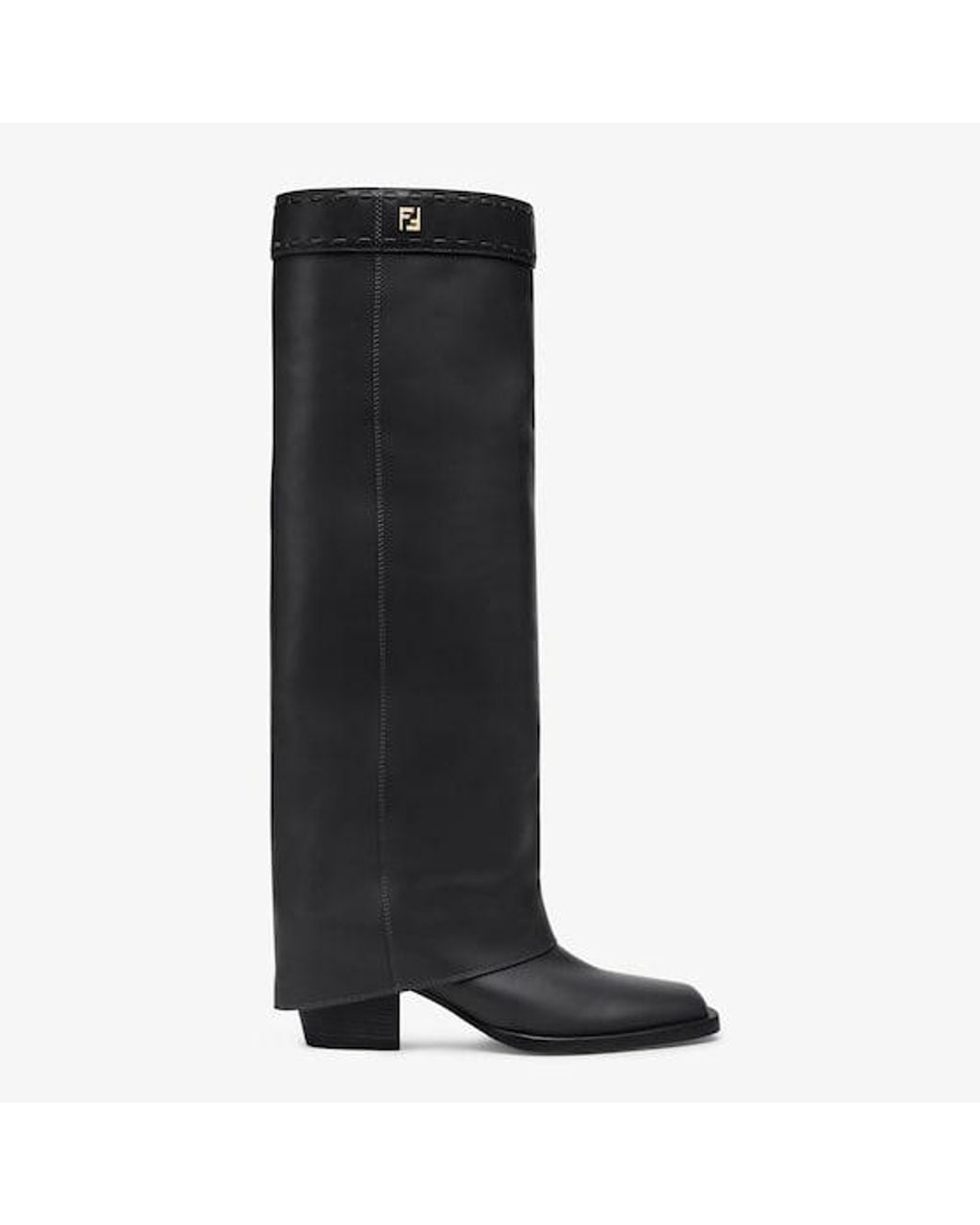 Square toe boots with tubular leg. Handmade in black leather. The leg partially covers the heel creating a trompe-l'oeil effect and soft creases on the front. FF strap at the knee, finished with hand-sewn tone-on-tone macro Selleria stitching, an emblem of the iconic Selleria workmanship handed down through generations of Fendi artisans since 1925. Made in Italy. Size 39 Color: black