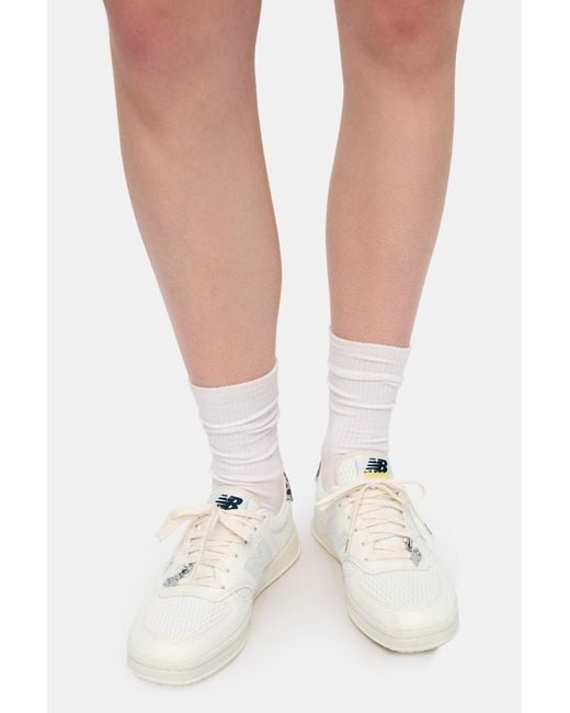 CREATE THE NEW For our New Balance collaboration, we reawaken a classic This limited-edition release introduces a bold new expression to the timeless T500 silhouette. Reimagined with signature GANNI leopard print, blending an iconic tennis sneaker with a twist of bold, rebellious style The GANNI x New Balance T500 is crafted using recycled materials throughout, featuring 100% recycled content in some of the upper vamp and tongue mesh, along with polyurethane overlays and recycled polyester mesh detailing These GANNI x New Balance T500 sneakers come in cream with matching cream-colored laces. The sneakers feature an embossed 'N' logo on the side in a matching color, a woven tongue label with GANNI and New Balance logos, and a leopard-printed heel with 'New Balance' logos. The shoes also come with two detachable charms: one featuring the GANNI Butterfly logo and the other featuring the 'NB' logo. GANNI GANNI x New Balance T500 Sneakers in White | Women's Size 14