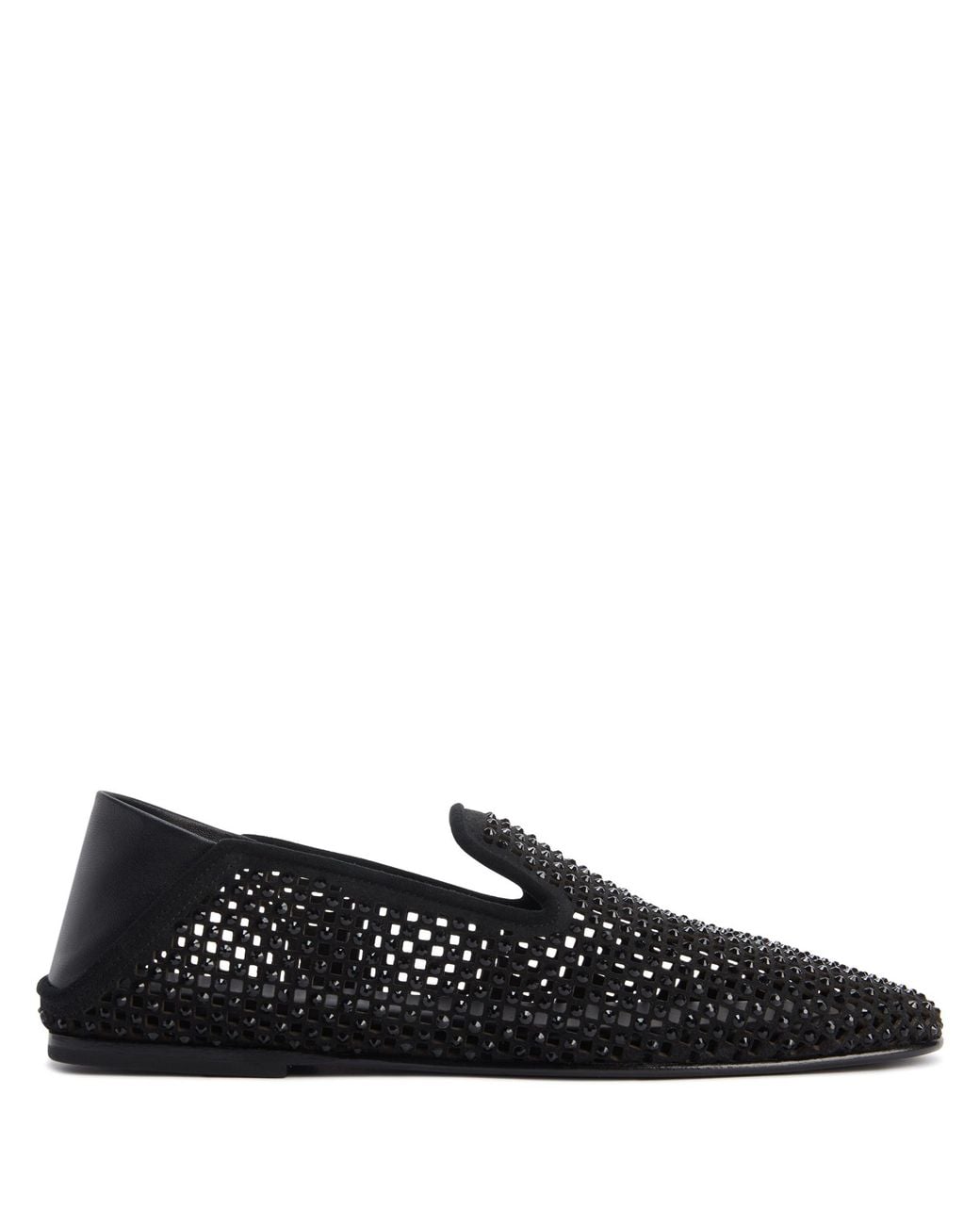 Perforated suede loafers with rhinestones and collapsible nappa leather heel counter that allows you to wear them as a sabot. Color: black