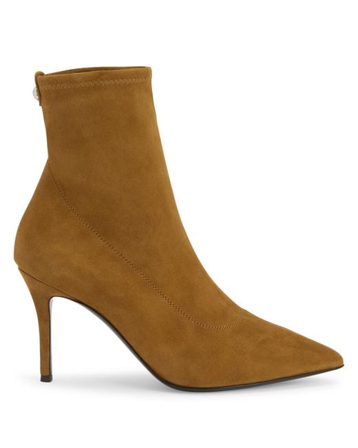 Brown stretch suede. Heel covered in brown stretch suede. 90 mm heel. Black leather sole with logo. Made in Italy.