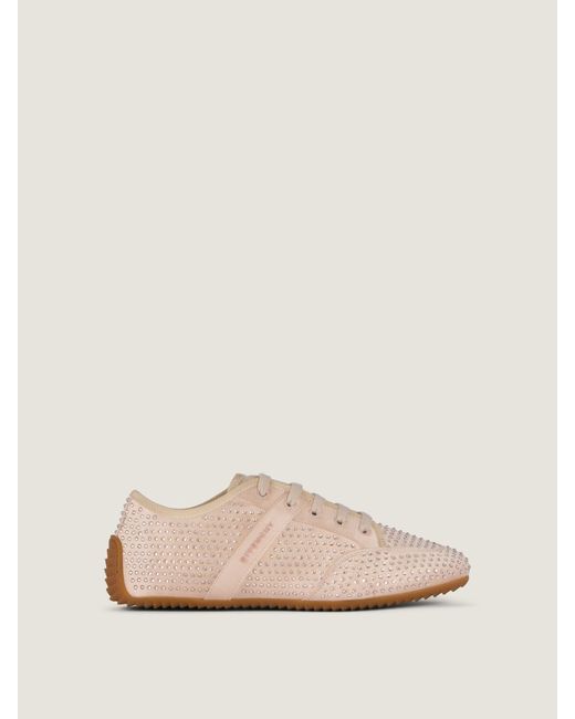 - Low sneakers in satin with all-over strass. - Slim line. - Raised GIVENCHY signature on the side. - GIVENCHY Paris signature printed on the leather insole. - Elastic for easy slip-on without unfastening. - Slim and flat silhouette with almond toe shape. - Thin rubber sole allowing great flexibility and comfort. Color: natural