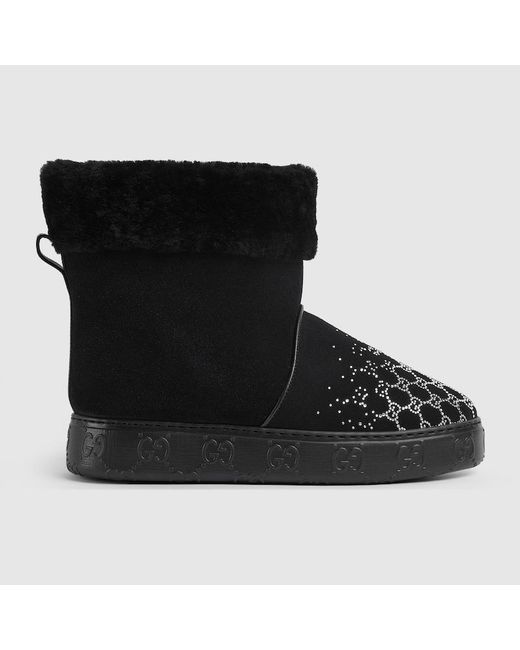Crafted in suede with gradient GG crystal motif, this women's boot combines comfort and heritage. The soft merino wool lining offers warmth and luxury, while the distinctive GG rubber sole adds a bold, contemporary twist rooted in the House's signature monogram. Black suede with gradient GG crystal motif, Black leather trim, Merino wool lining, GG rubber sole, Flat, Made in Italy Color: black