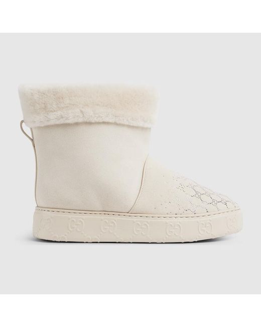 Crafted in suede with gradient GG crystal motif, this women's boot combines comfort and heritage. The soft merino wool lining offers warmth and luxury, while the distinctive GG rubber sole adds a bold, contemporary twist rooted in the House's signature monogram. White suede with gradient GG crystal motif, White leather trim, Merino wool lining, GG rubber sole, Flat, Made in Italy