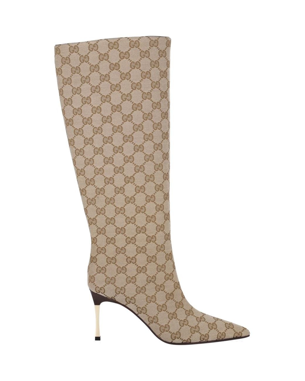 - Boots "Bombshell" Gucci in beige fabric - all-over "GG Supreme" pattern - pointed design - stiletto heel - leather sole - sole: 100% leather - shaft height: 40 cm Color: white
