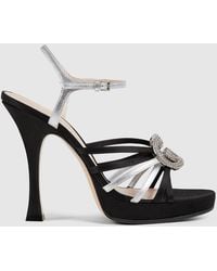 Go to GucciA crystal-set Double G elevates a selection of feminine footwear. The sparkling hardware adorns a variety of designs, from slides to platform pumps, complemented by colored patent or metallic leather. This design appears
