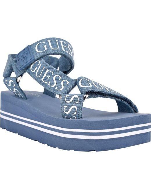 Logo‑printed denim straps bring signature brand energy to this platform sandal secured with a hook‑and‑loop ankle strap. 2" heel; 1 1/4" platform; 3/4" heel slope Adjustable ankle strap with hook-and-loop closure Textile upper and lining/synthetic sole Imported Color: blue