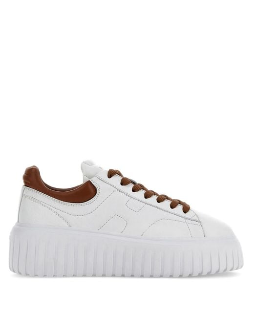 A new model with sporty and versatile lines, the h-stripes sneaker features an extra-light sole with vertical stripes and waves on the tread. The upper, with a compact and balanced design, is distinguished by an h that extends across the entire side. The upper, with stitching on the heel, has soft padding. These sneakers are made of nappa leather, with a memory foam footbed that provides cushioning. - made in italy - lateral h - 8 mm memory foam footbed - eva sole - includes an additional pair of laces designer id: hxw6450fc60le90446 sole height: 6 cmSpecificationValueSeasonSS26CompositionUPPER: LEATHER LINING: LEATHER AND FABRIC SOLE: RUBBERColorWHITE/BROWNColor Code0446Made InITALYISOITDepartmentWomenSectionSHOESSubsectionSNEAKERSSize InformationSHOES ITSize CodeIT Color: white