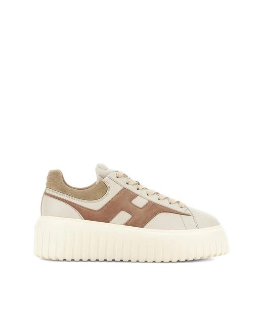 Light beige platform sole lace-up fastening leather upper suede detailing 'h' logo stripe Color: natural