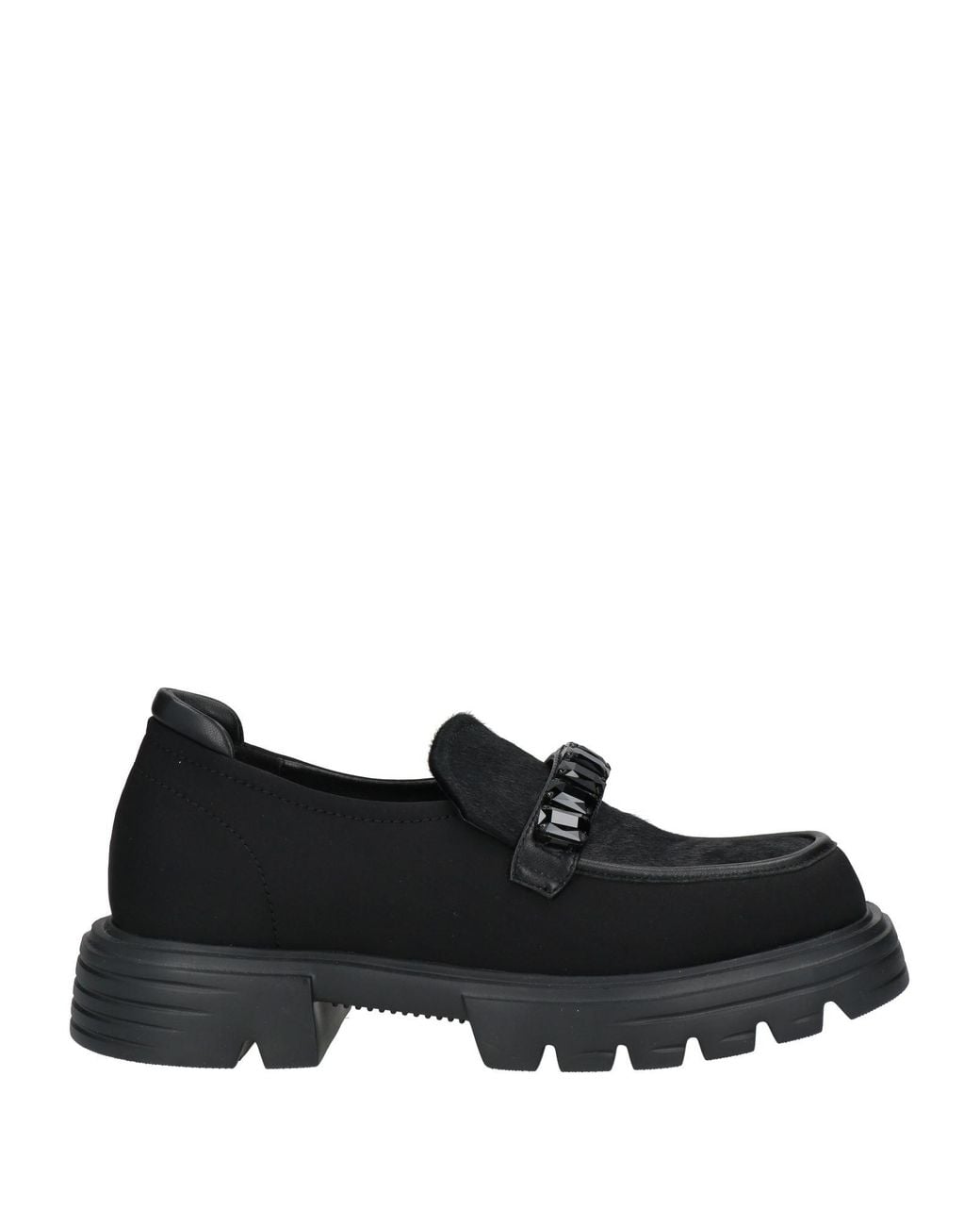 Calf hair, leather, crystals, solid color with appliqués, leather lining, round toe, square heel, rubber cleated sole, contains non-textile parts of animal origin, chunky loafers , Color: Black , Size: 9