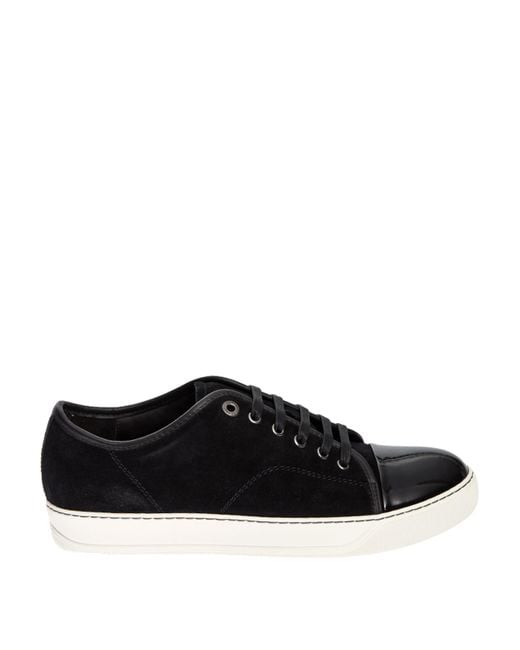 Crafted from soft suede, these low top sneakers are detailed with lace-up front, tonal napa leather piping and patent leather toe-cap, contrasting rubber box sole. Color: black