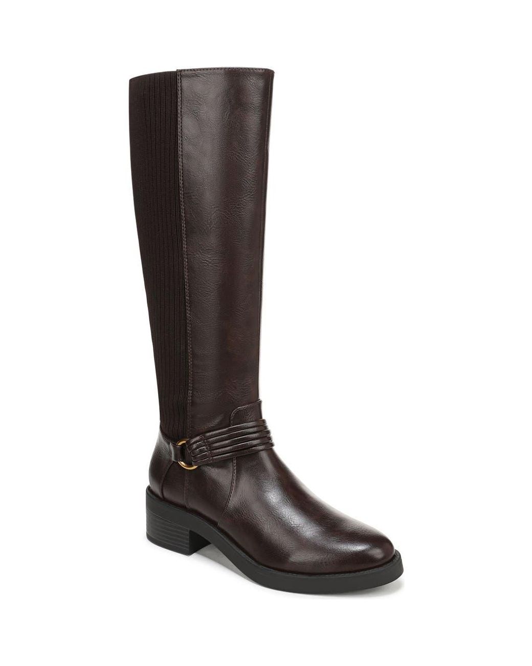 A stretch-knit back panel offers a customized feel on a knee-high faux-leather boot featuring underfoot cushioning and lifted by a low, stacked heel. Color: brown