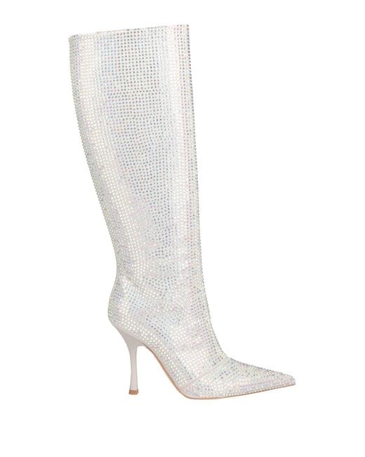 Plain weave, rhinestones, solid colour with appliqués, leather backing, zipper closure, narrow toeline, spool heel, rubber sole, contains non-textile parts of animal origin, boots , Color: Silver , Size: 9