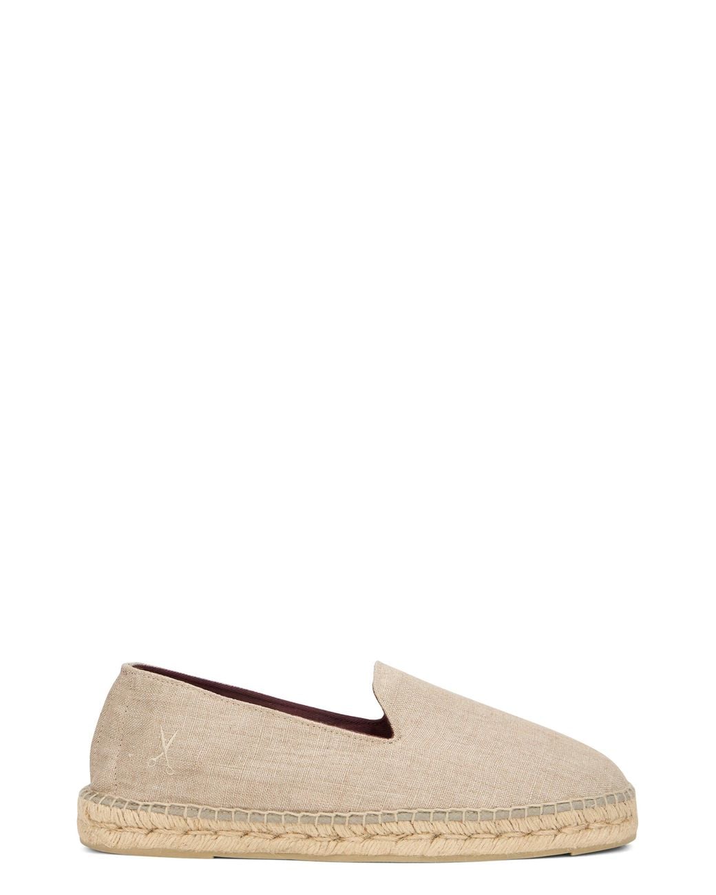 Espadrille-style shoe made from lightweight and breathable canvas. It features a simple and minimalist design, characterized by an upper in an elegant neutral tone and a jute sole that adds a natural touch. Ideal for summer outfits, it offers comfort and versatility, perfect for casual occasions or moments of relaxation. The low silhouette enhances wearability, making it a practical choice for the warm season. 100% Linen Color: white