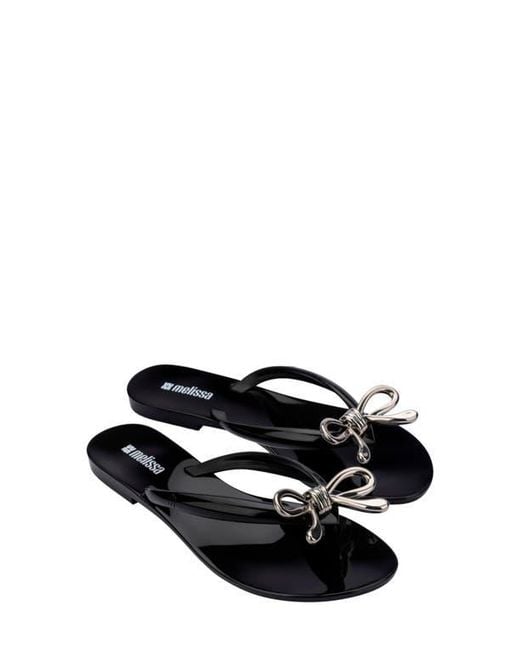 A whimsical metallic bow tops this water-resistant flip-flop crafted from the brand's signature fruit-scented PVC. Color: black