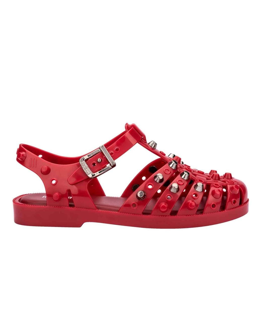 Our beloved staple has been elevated to new heights, and it's your turn to feel like the main character. Get your very own Melissa Possession Studs, a 100% recyclable sandal featuring a PVC upper and structure, nylon buckle, and stud adornments. The classic and timeless style has a casual design that will perfectly match all your fashion ensembles. Buckle closure 100% Recyclable material PVC upper and structure Sole with weight reduction for a light feel Casual model Classic and timeless style Nylon buckle Stud-like effect decoration in nylon Crafted from the innovative Melflex® PVC plastic this piece is ultra-lightweight. The upper is made of 100% PVC, the insole of laminated PVC, and the sole of 100% EVA. Easy care item that just needs a wipe clean. Furthermore, they are entirely recyclable, aligning with eco-conscious values Color: red