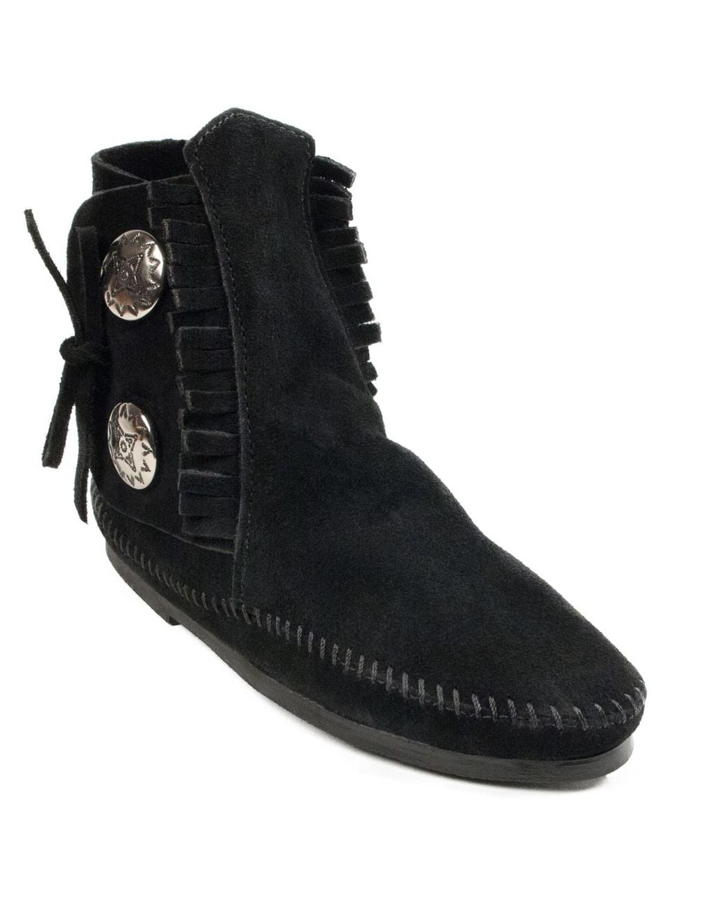 Their fashion statement lives on today. Traditional fringe, decorative metal conchos and suede ties help you look hippie chic. Handmade from the softest suede from the same design as nearly fifty years ago, these boots make it easy to keep on dancing. Color: black