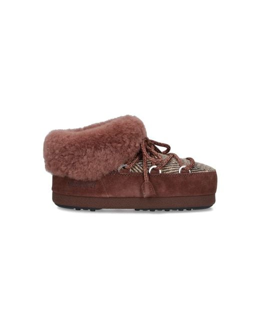 Moon Boot x Guest in Residence EVX Mule boots in brown suede with round toe, laces, shearling detail, tone-on-tone embossed logo on the side, slip-on fit, and rubber sole. - Sole: 100% rubber Color: brown