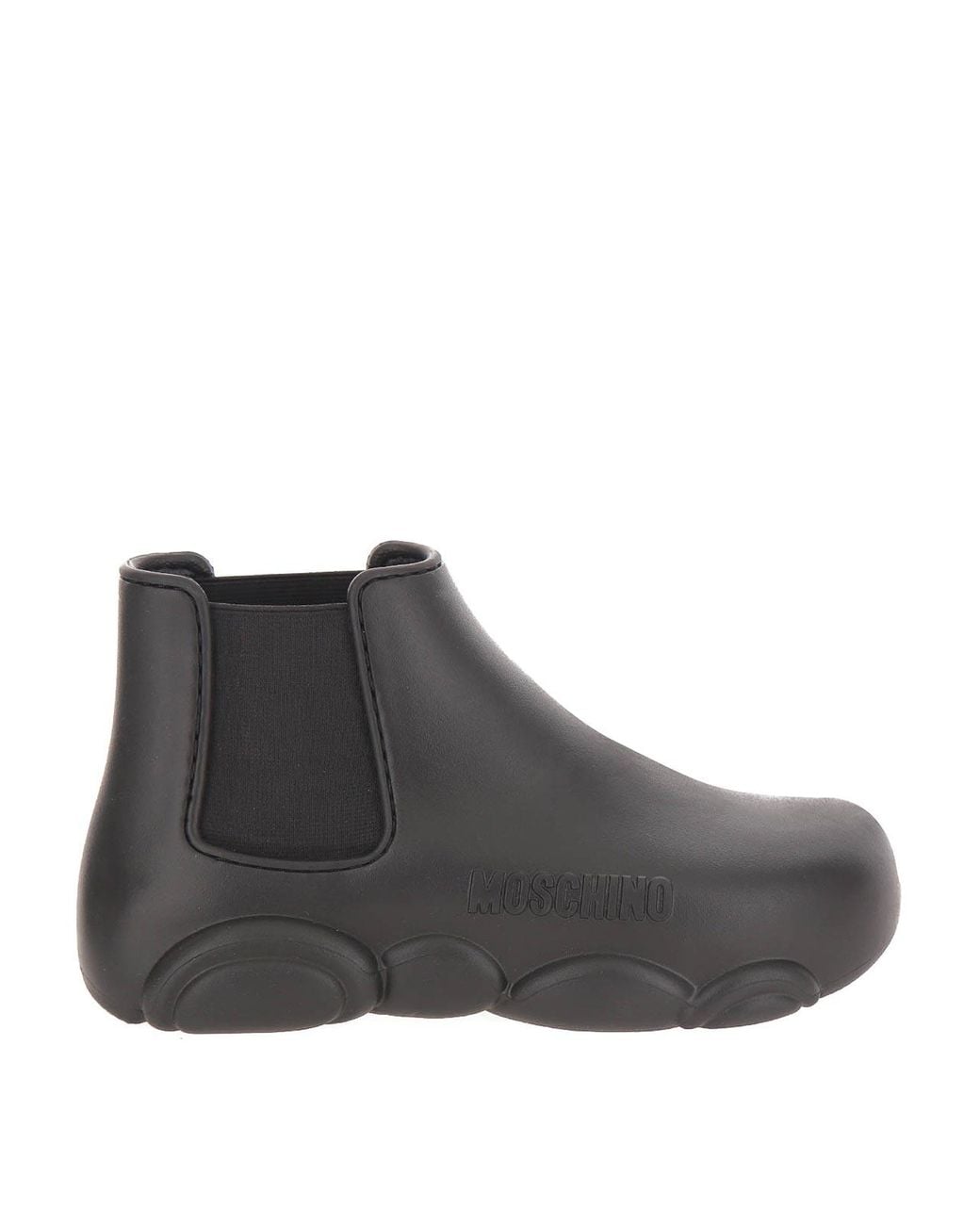 Rain boot in black moulded shoe featuring iconic moschino teddy bear shaped moschino logo lettering in high relief on side elasticated fit color black Color: black