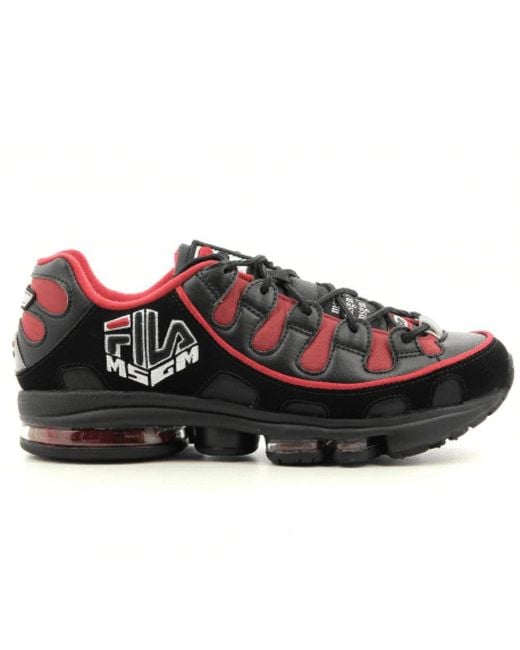 Introducing the Silva Sneakers, a standout collaboration between Msgm and Fila. These sneakers feature embroidered logos and air bubble soles, making them a collector`s item this season. Key attributes: Black | Red | Leather | Canvas | Embroidered logos | Air bubble soles | Dimensions & fit: Regular fit | Composition & care: Leather | Canvas | Wipe clean with a damp cloth Color: black