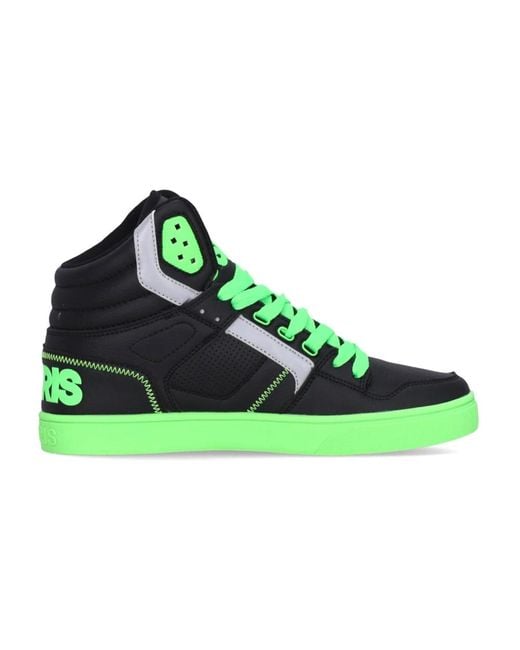 Elevate your street style with these high-top skate shoes from Osiris. Featuring a lace-up closure, padded collar, and the iconic rubber Osiris logo on the tongue, sole, and heel reinforcement. The upper is made with synthetic panels, reinforced toe, and perforated details. Finished with a rubber sole and EVA insole. Color: green