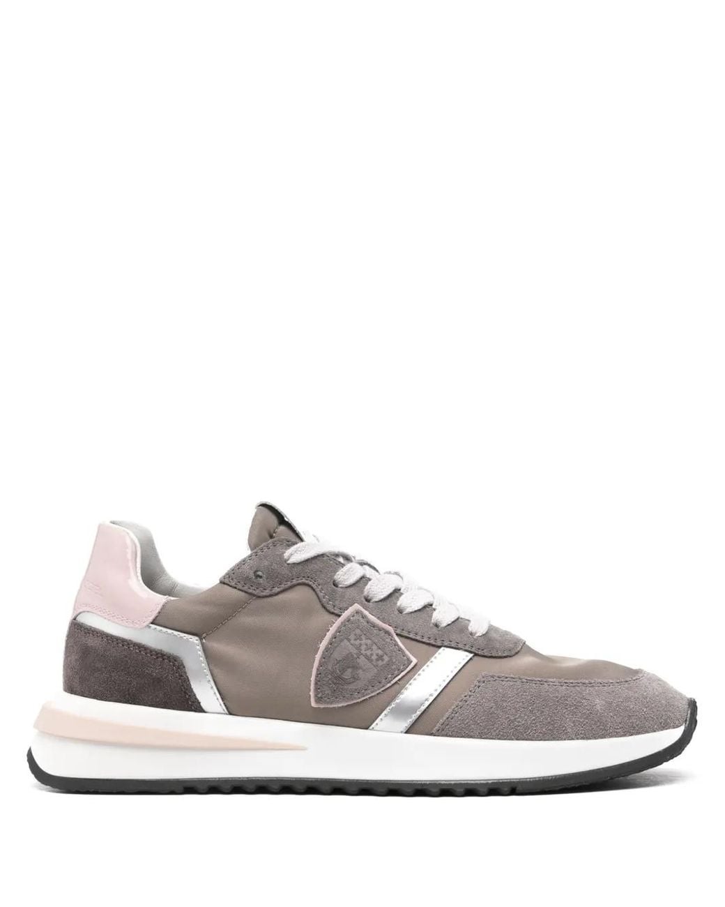 Stone grey panelled design suede panels leather trim metallic effect panels round toe logo patch to the side logo patch at the tongue patent-finish contrasting branded heel counter padded ankle cushioned branded insole flat rubber sole with 3D detailing front lace-up fastening Size: 35. Gender: Female. Material:Suede.