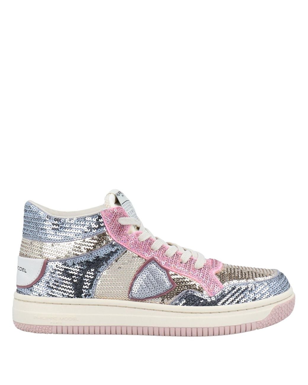 Techno fabric, leather, sequins, multicolor pattern, leather lining, laces, round toeline, flat, rubber cleated sole, contains non-textile parts of animal origin. Textile fibers, Soft Leather.