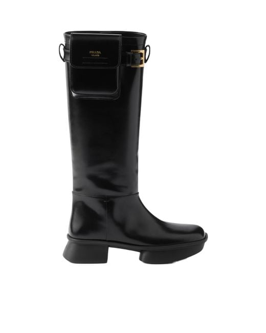 Triangle Logo Leather Block-Heel Knee Boots - Black