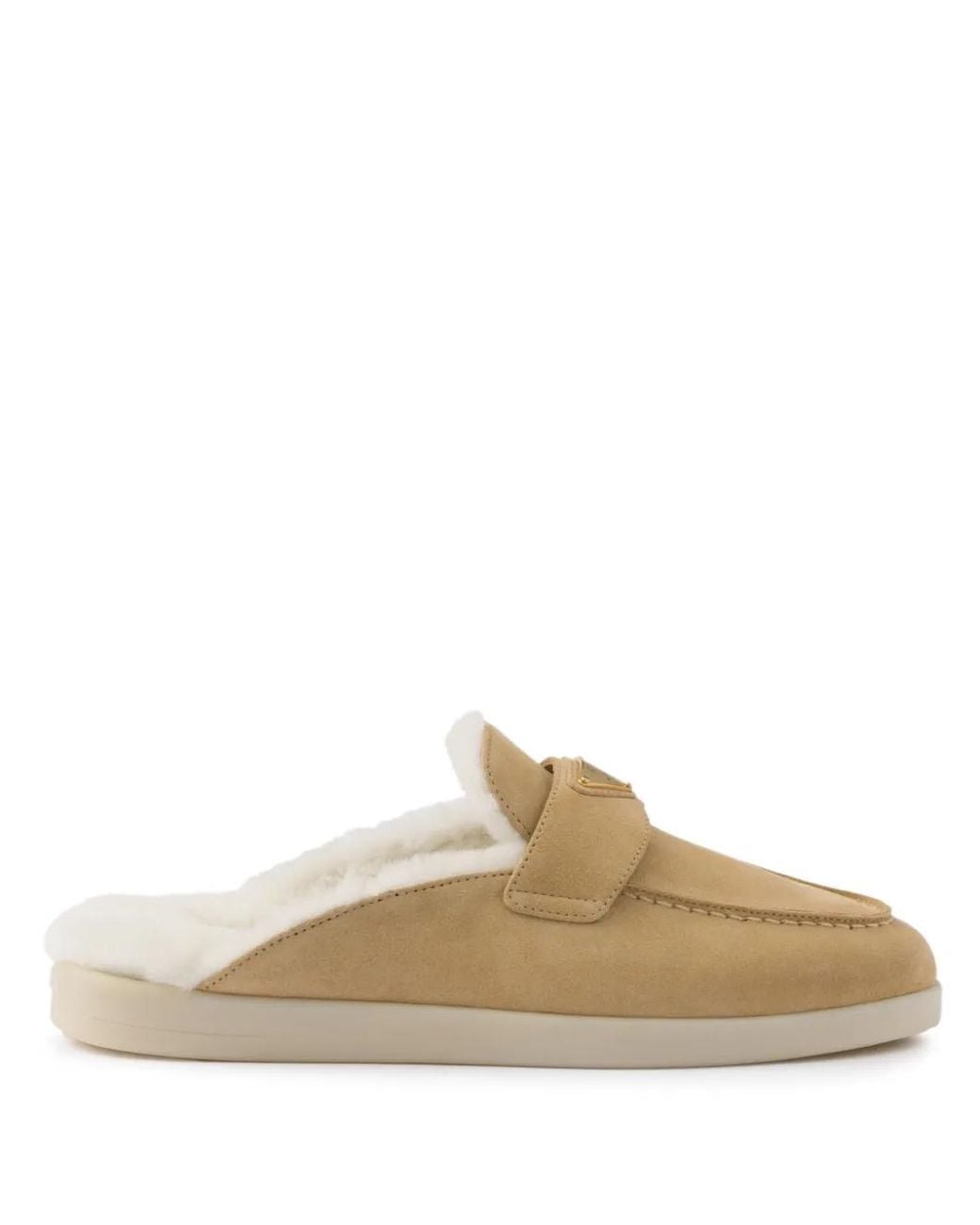Beige shearling lining enamel triangle logo round toe slip-on style flat rubber sole Size: 35.5. Gender: Female. Material:Calf Suede/Sheep Skin/Shearling/Rubber. Color: white