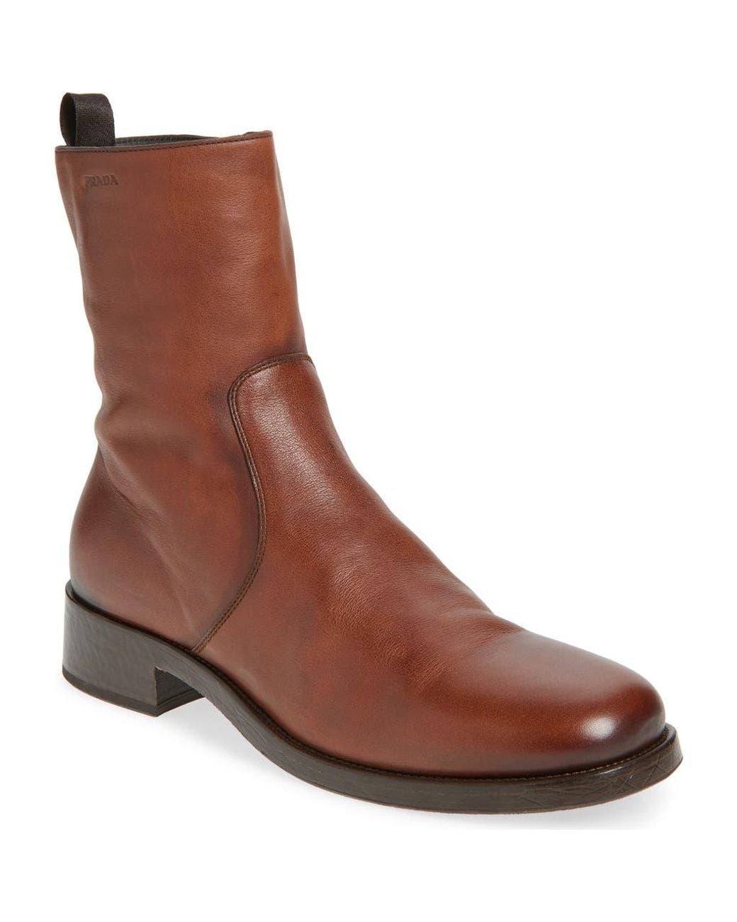 Prada's legacy of artisan shoemaking shines through the richly grained, supple calfskin leather and Italian craftsmanship of this boot detailed with a subtly embossed logo at the shaft. Color: brown