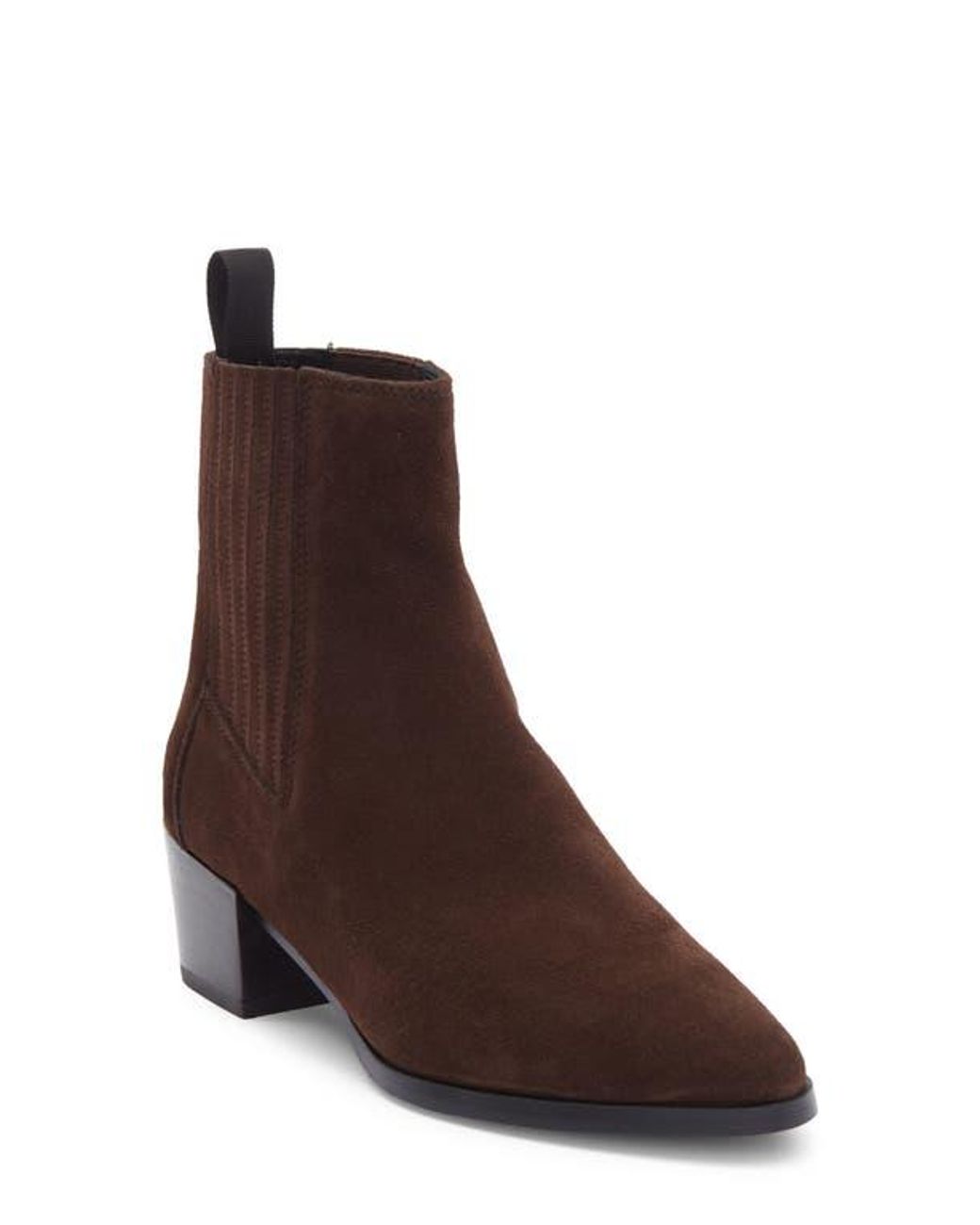 A pointy toe and block heel balance a sleek leather bootie fashioned with stretchy side panels for easy entry. 2" heel Pull-on style with elastic gore insets Leather upper and lining/synthetic sole Imported