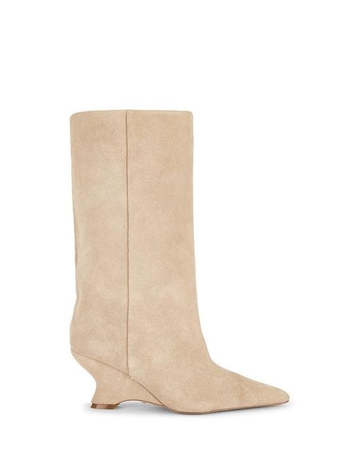 RAYE Vienna Boot in Neutral. - size 6.5 (also in 7, 7.5, 8, 9, 9.5) RAYE Vienna Boot in Neutral. - size 6.5 (also in 7, 7.5, 8, 9, 9.5) Suede upper with manmade sole. Made in China. Pull-on styling. Cushioned leather footbed with textile lining. Pointed toe. Wedge heel. Approx 75mm/ 3 inch heel Approx 279.4mm/ 11 inch shaft Opening measures approx 18.84 in circumference. RAYE-WZ2982. RYSH10130 R25. Inspired by the word Reina, the Spanish word for queen, Raye is the queen bee shoe brand that will surely capture your heart. With an extensive assortment of silhouettes from heels to boots and sandals to flats, Raye has that perfect something for everyone. Color: natural