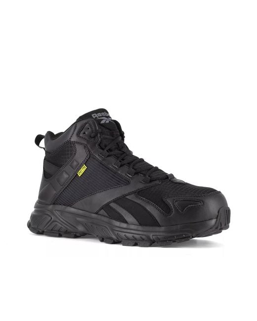 Confidently tread on any terrain with the Hyperium Composite Toe work boot from Reebok Work. The 3D terrain visual effect on the vamp brings all eyes towards this fabric boot, enhanced with a MemoryTech memory foam footbed and Fuelfoam midsole for impressive step-in comfort. EH rating and internal metatarsal guard provide reliable safety, while an oil- and slip-resistant bottom offers optimal support. Color: black