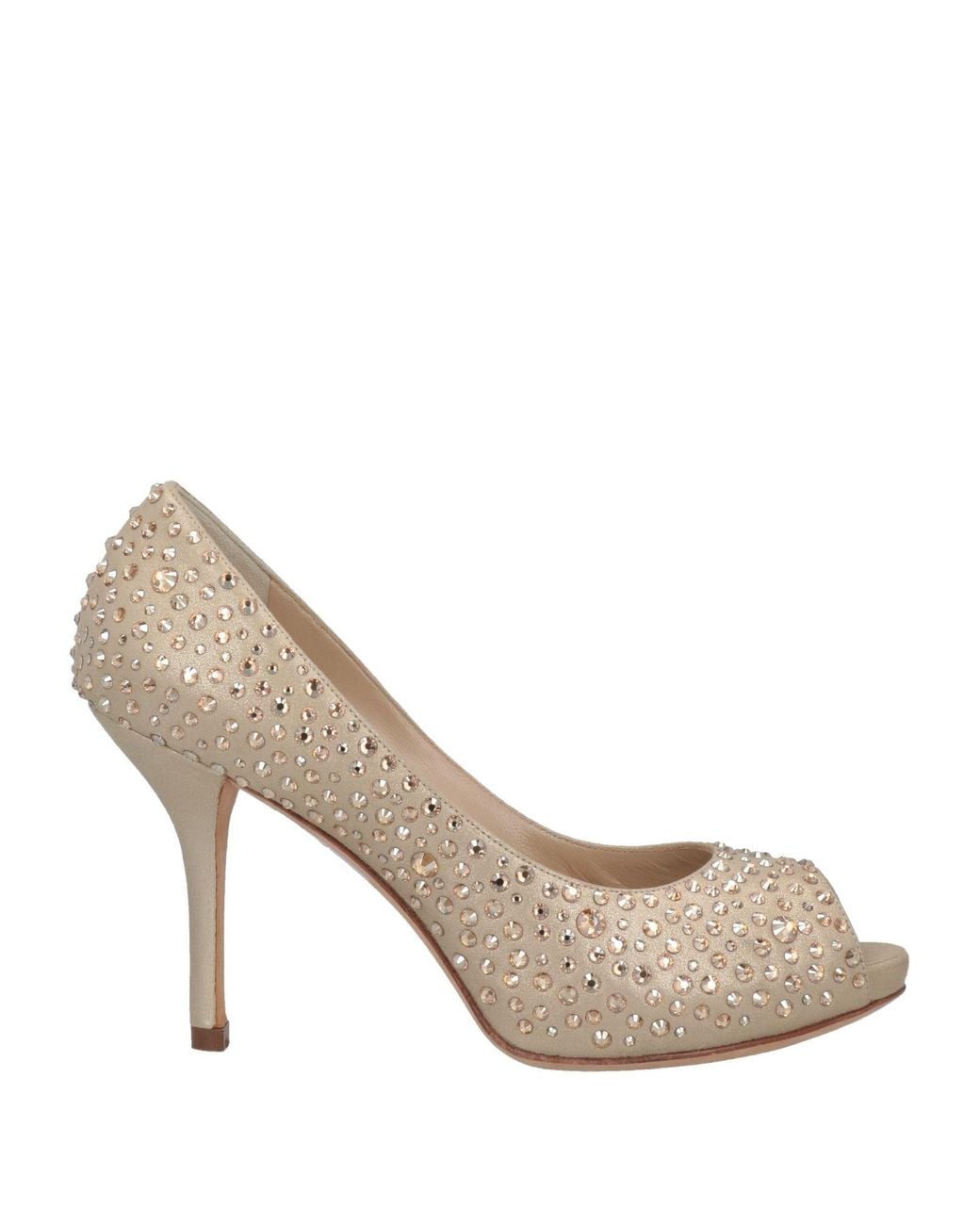 Leather, laminated effect, rhinestones, solid colour with appliqués, leather backing, narrow toeline, stiletto heel, leather sole, contains non-textile parts of animal origin, open-toe pumps , Color: Gold , Size: 6.5