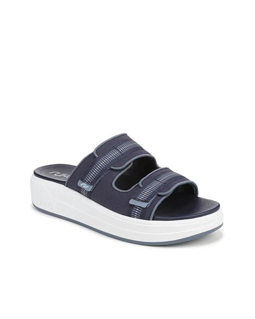 The Viv Slide sandal by Ryka features a sleek fabric upper with adjustable hook-and-loop straps for a custom fit. This pair also rocks a cushioned EVA footbed and a dual-density sole for stability and support, offering all-day comfort with a stylish platform design. Color: blue