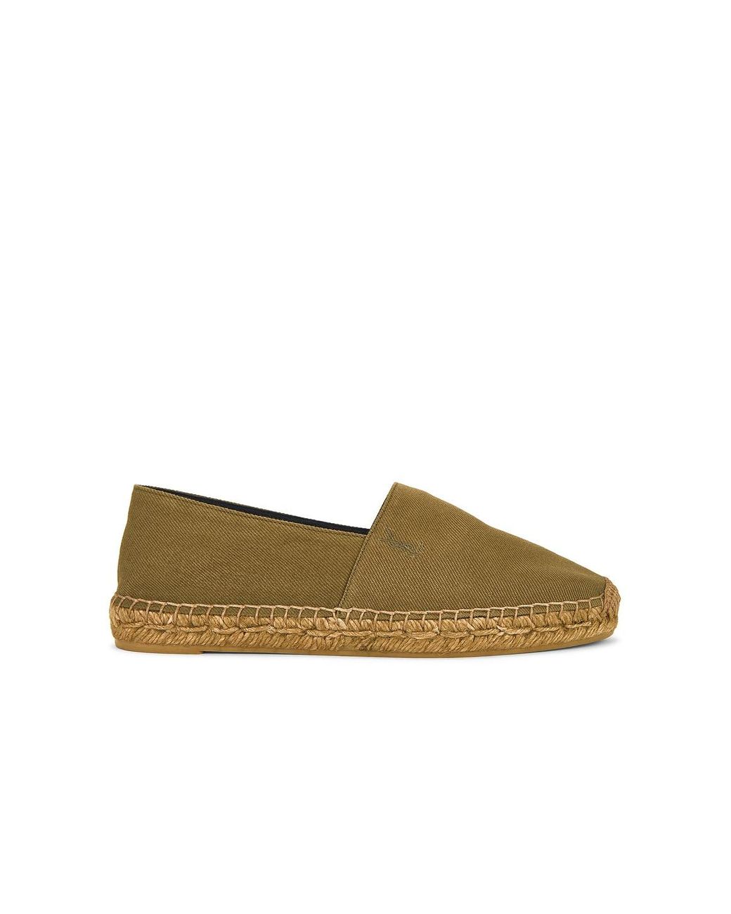 Saint Laurent Espadrille in Brown Canvas upper with rubber sole. Made in Italy. Logo embroidered detail on side. Approx 10mm/ 0.5 inch platform. SLAU-WZ1407. 818248-AADNX-3302. About the designer: SAINT LAURENT has been influencing and revolutionizing the fashion industry since the debut of its iconic ‘Rive Gauche’ collection in 1966 - the couture house was the first to create a ready-to-wear capsule. The sleek, precisely tailored staples, like the signature biker jackets, transcend seasons and trends. Creative Director Anthony Vaccarello continues to honor the label’s illustrious reputation by reintroducing cult styles, including the ‘Lou’ handbag and ‘Tribute’ sandals. Color: green