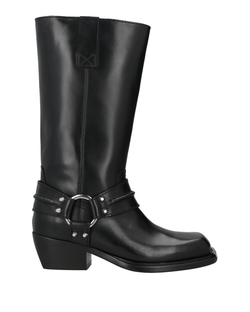 Cowboy boots, leather, solid color with appliqués, strap detailing, studs, leather lining, square toe, cuban heel, leather sole, contains non-textile parts of animal origin , Color: Black , Size: 5