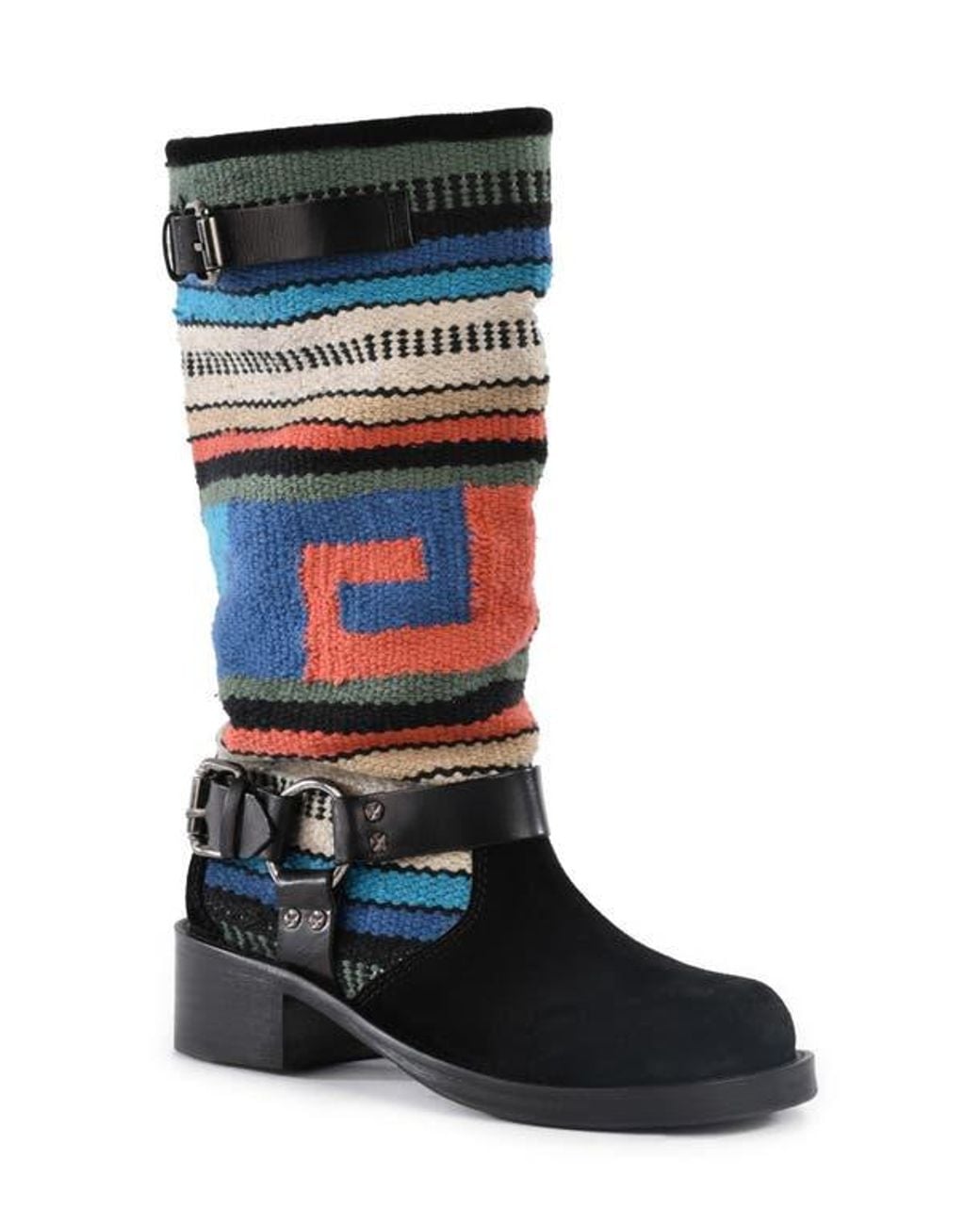 A woven shaft featuring colorful stripes and geometric patterns enhances the vintage vibes of this block-heel boot complete with a harness strap. Color: black
