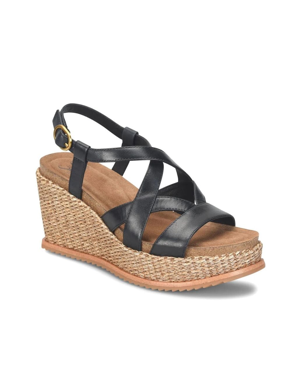 With a high-quality leather material and and a durable TPR sole, the Devyn wedge sandals from Sofft are sure to be a staple year after year. The classic silhouette features an interlocking strappy upper and a beachy woven heel. Color: black
