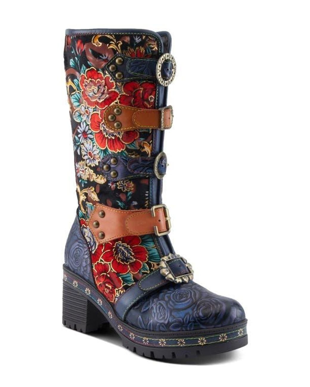 Refresh your rotation of boots with this artisanal mixed-media version blossoming with hand-painted flowers and embossed roses. A row of antique-finish buckles along the shaft complete the look, while a faux-fur lining brings coziness to every step. Color: blue