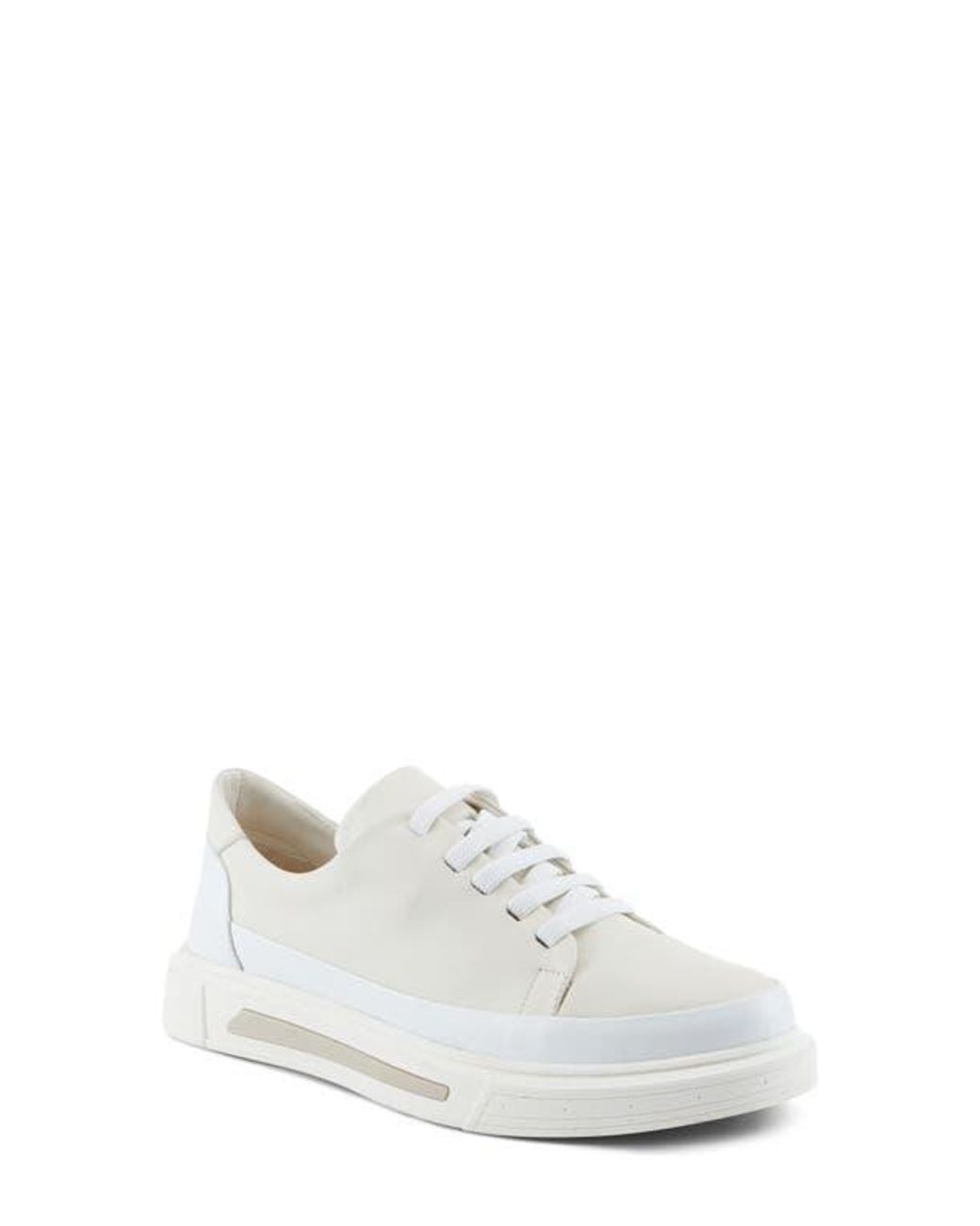 Elastic laces deliver slip-on convenience to this leather sneaker set on a sporty platform and removable leather insole. Color: white