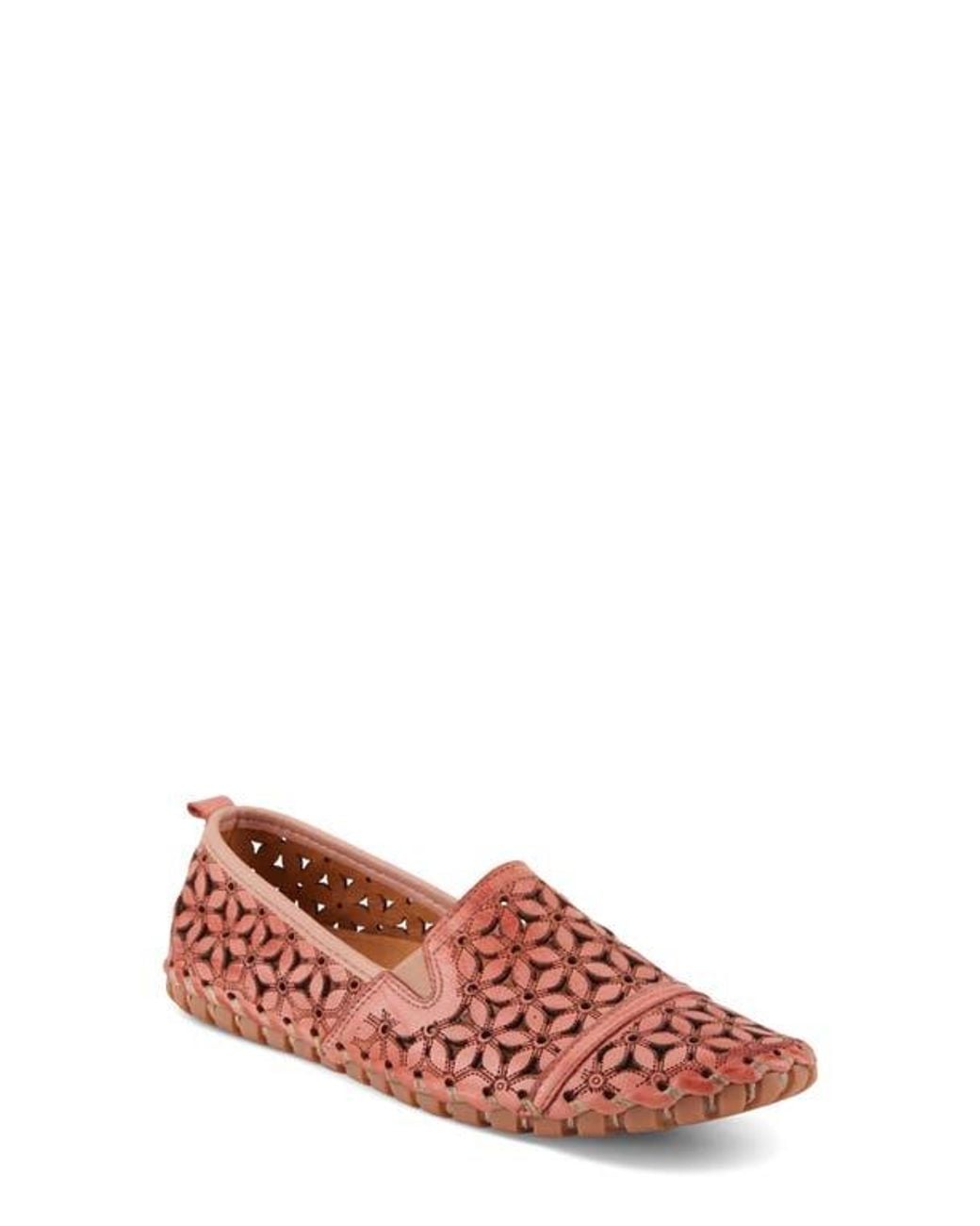 A laser-cut floral motif and tonal whipstitching detail a low-profile flat that keeps you comfortably and stylishly on your feet. Color: red
