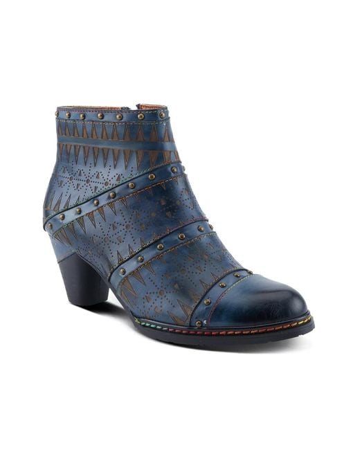 Turn everyone's attention towards your look with the L'Artiste Niobe bootie. Beautiful etched patterns between gold studding details on the vamp offer a captivating appeal to this bootie. Partially stacked and partially covered block heel offers a striking appeal. Click here for Boot Measuring Guide. Color: blue