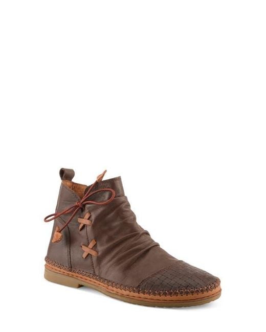 Whipstitching, woven details and a slouchy upper give a vintage-inspired feel to a flexible leather bootie. Color: brown