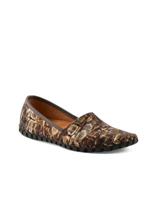 The Kathaleta flat from Spring Step features a signature Fusaro construction that is Opanka hand-stitched for superior flexibility and durability. The removable cushioned leather insole with extra arch support keeps you comfortable while the center elastic gore ensures a flexible and secure fit for easy slip-on wear. Color: brown