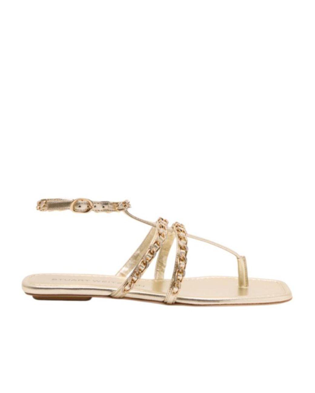 Chain embellishment, crystal accents, square head design, adjustable ankle strap, flat bottom. Color: natural