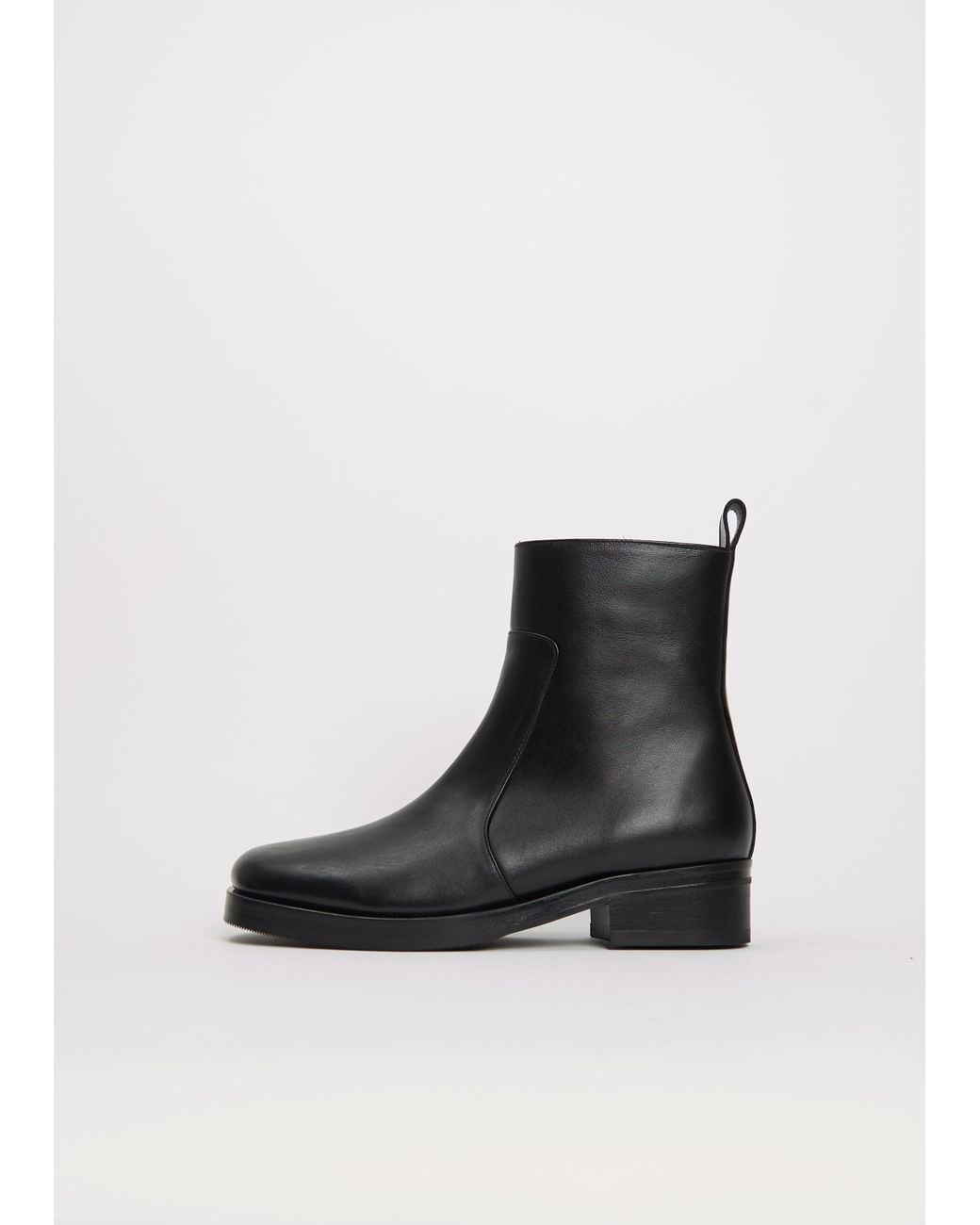 Studio Nicholson black paneled boot with a square toe and concealed silver-hued side zipper closure in smooth Italian calf leather. Features a stacked heel and a sturdy Vibram sole. Sizing: European (36-41). Upper: 100% Leather. Made in Portugal. Color: black