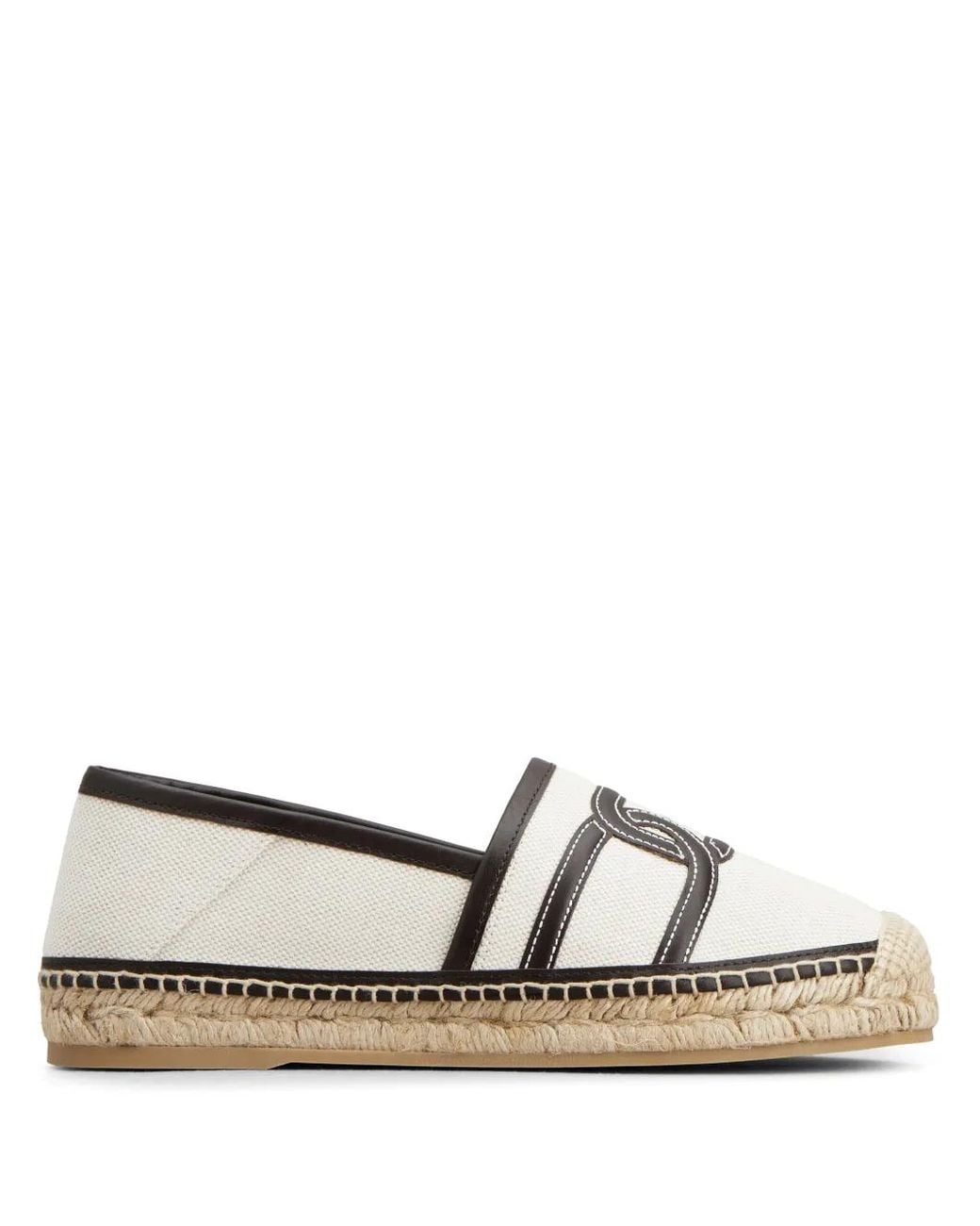 Off-white/black canvas leather trim chain pattern contrast stitching round toe slip-on style jute insole rubber sole Size: 36. Gender: Female. Material:Leather.